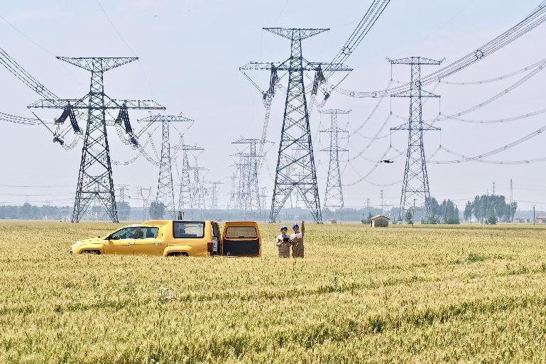 国网天津高压公司员工对特高压线路开展无人机巡检。