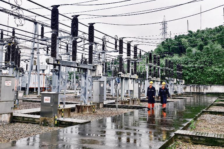 国网山东东营供电公司员工在变电站内开展雨后特巡。