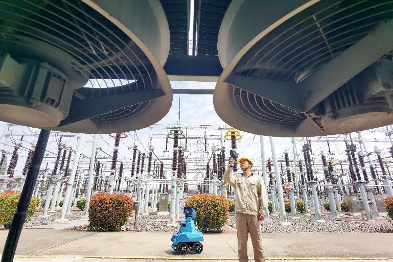 国网江苏扬州供电公司员工与机器人协同对220千伏变电站内设备进行特巡。