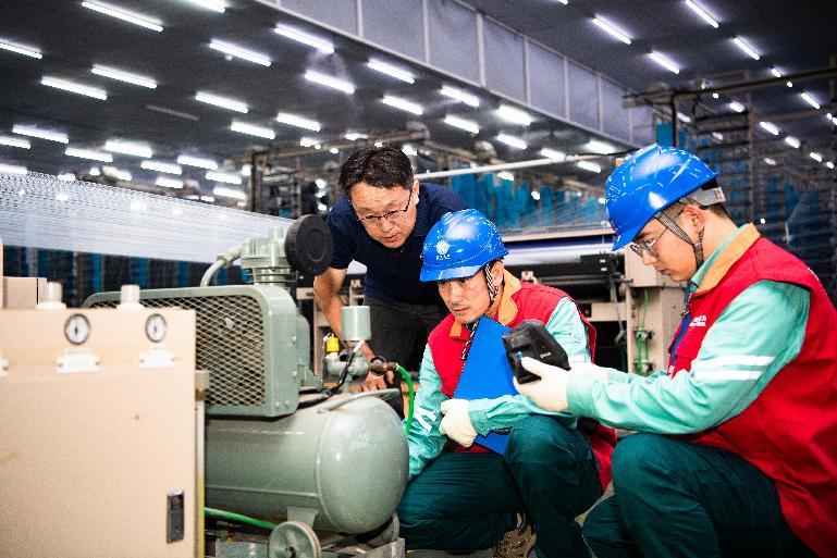 国家电网山东电力(淄博)彩虹共产党员服务队队员在恒利纺织科技公司检查用电设备。