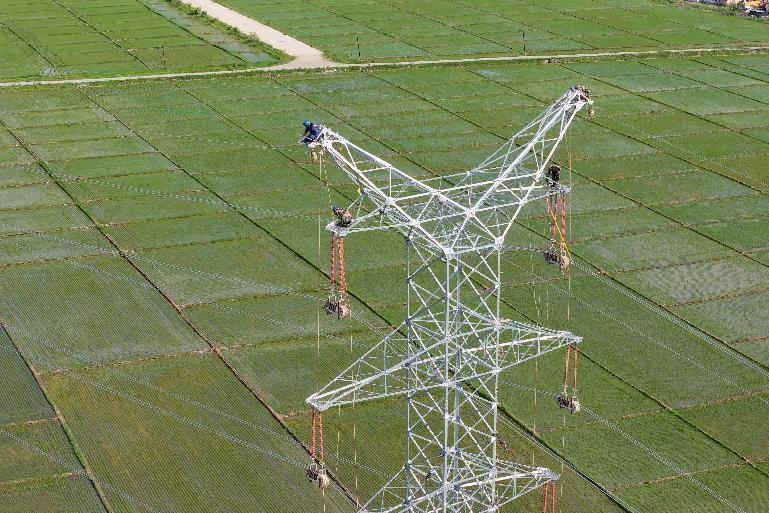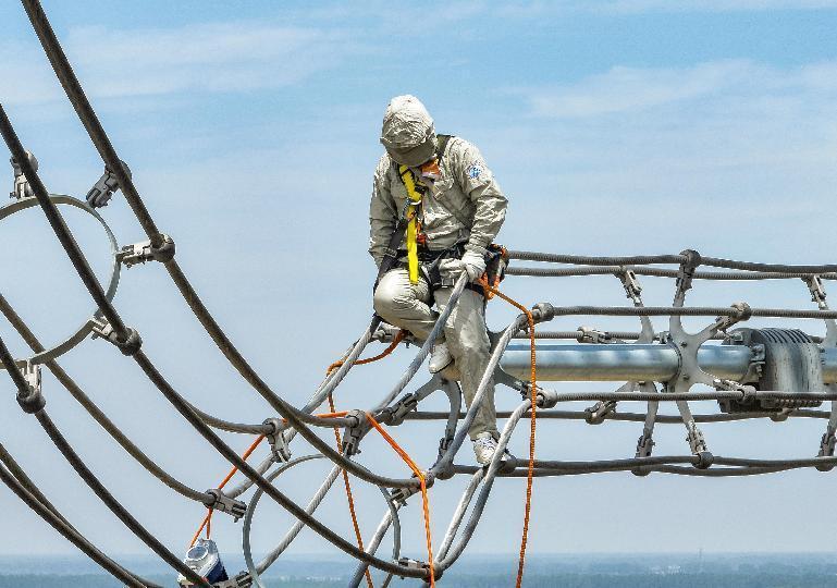 国网浙江温州供电公司员工在500千伏线路开展精细化检修作业。
