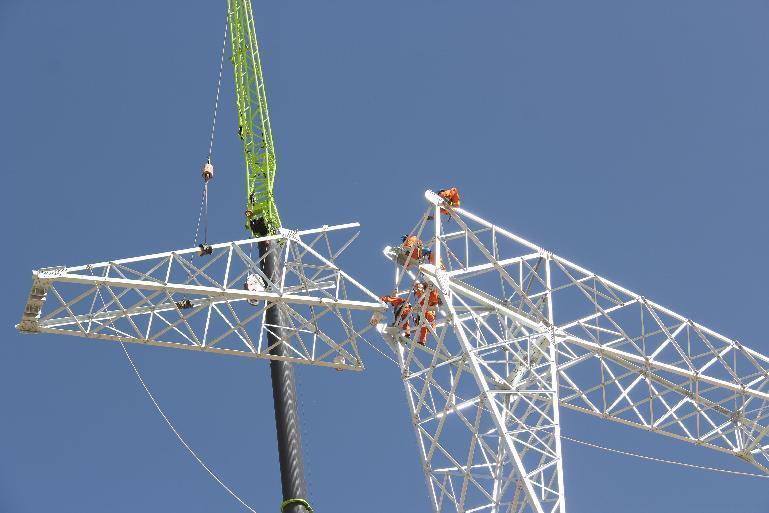 青海送变电公司员工在花土沟镇组立750千伏线路铁塔。