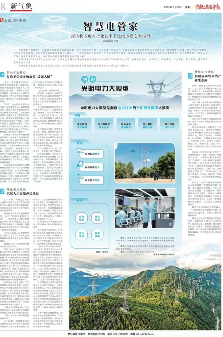 6月30日,《中国纪检监察报》刊发“走近大国重器”整版专题报道《智慧电管家——探访我国电力行业首个千亿级多模态大模型》,聚焦光明电力大模型,展现国家电网有限公司坚持创新驱动发展,深度应用人工智能大模型技术,赋能电力行业数字化转型,助力新型电力系统和新型能源体系建设,为经济社会高质量发展赋动能。