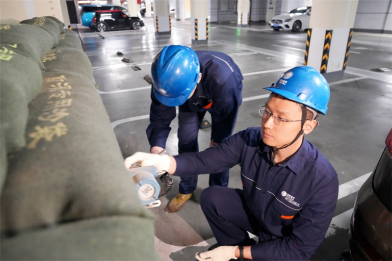 国网辽宁沈阳供电公司员工在小区地下配电室检查智能水浸监测装置。
