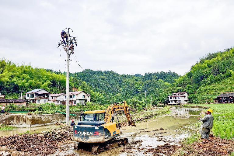 国网湖南邵阳供电公司员工在金屋塘镇抢修因暴雨受损的配电线路。