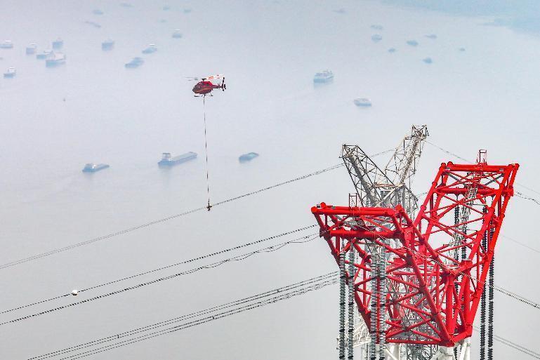 国网安徽马鞍山供电公司员工采用直升机作业方式开展500千伏线路缺陷消除工作。