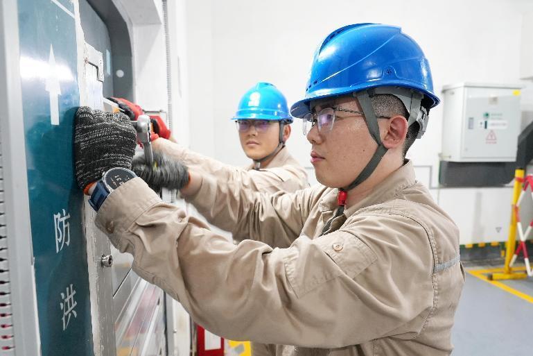 国网福建福州供电公司员工在“防淹型”配电站房内安装防水挡板。