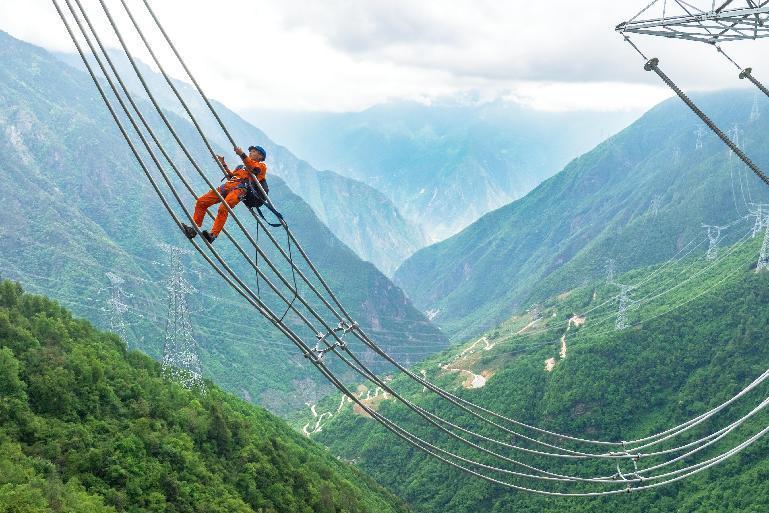 国网四川送变电公司员工通过走线方式对±800千伏特高压直流输电工程线路开展验收。