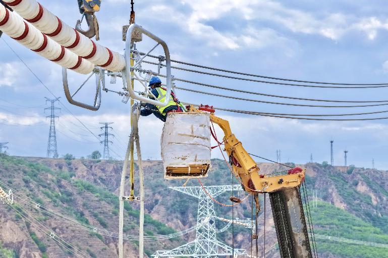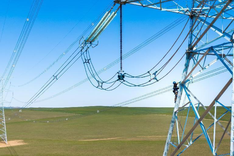 国网内蒙古超特高压公司员工对500千伏线路开展缺陷消除作业。